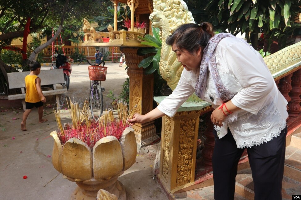 ប្រជាពលរដ្ឋកំពុងអុជធូបបួងសួង ក្នុងថ្ងៃបិណ្ឌទី១៣ នៃពិធីបុណ្យភ្ជុំបិណ្ឌនៅរាជធានីភ្នំពេញ នៅថ្ងៃទី២៦ ខែកញ្ញា ឆ្នាំ២០១៩។ (កាន់ វិច្ឆិកា/VOA)