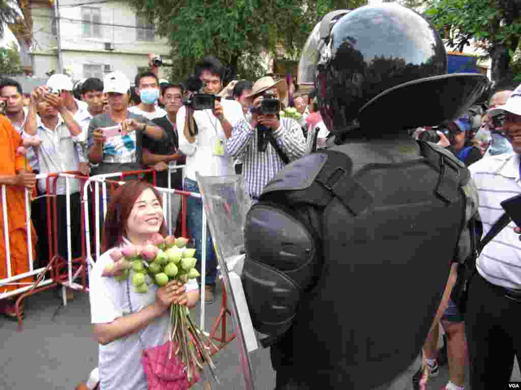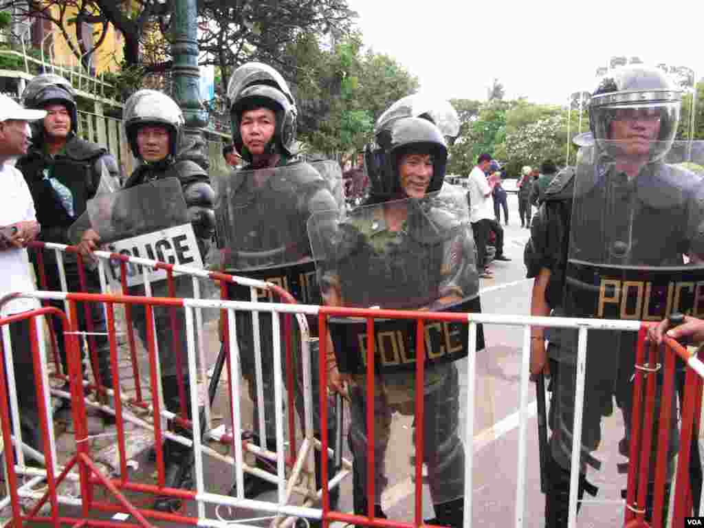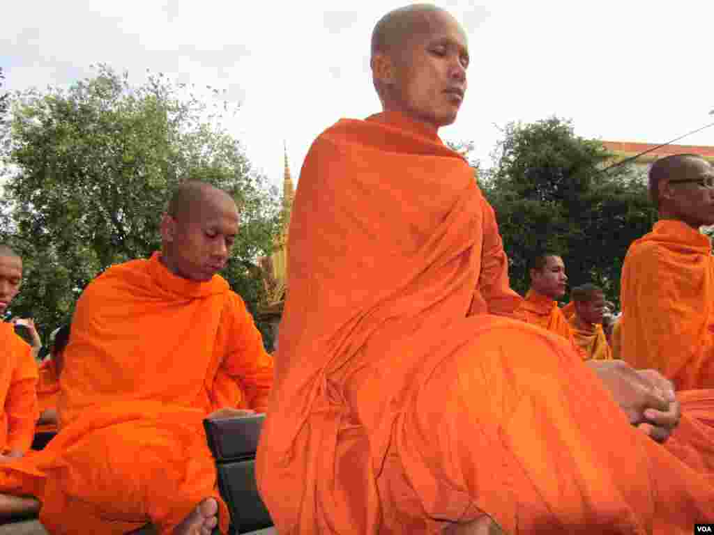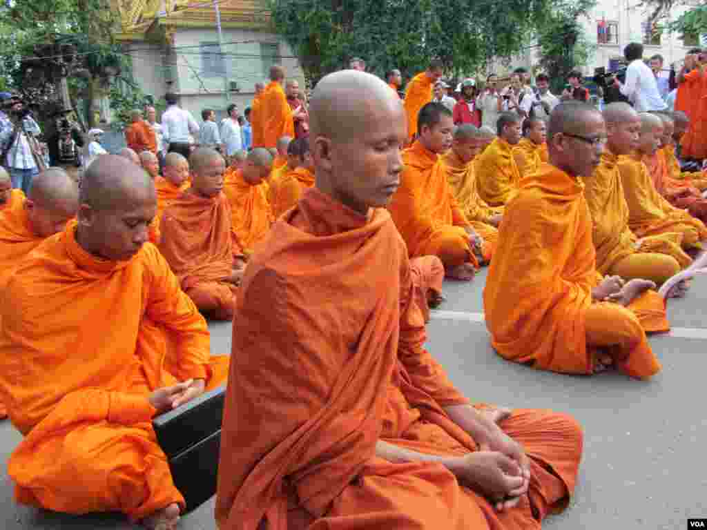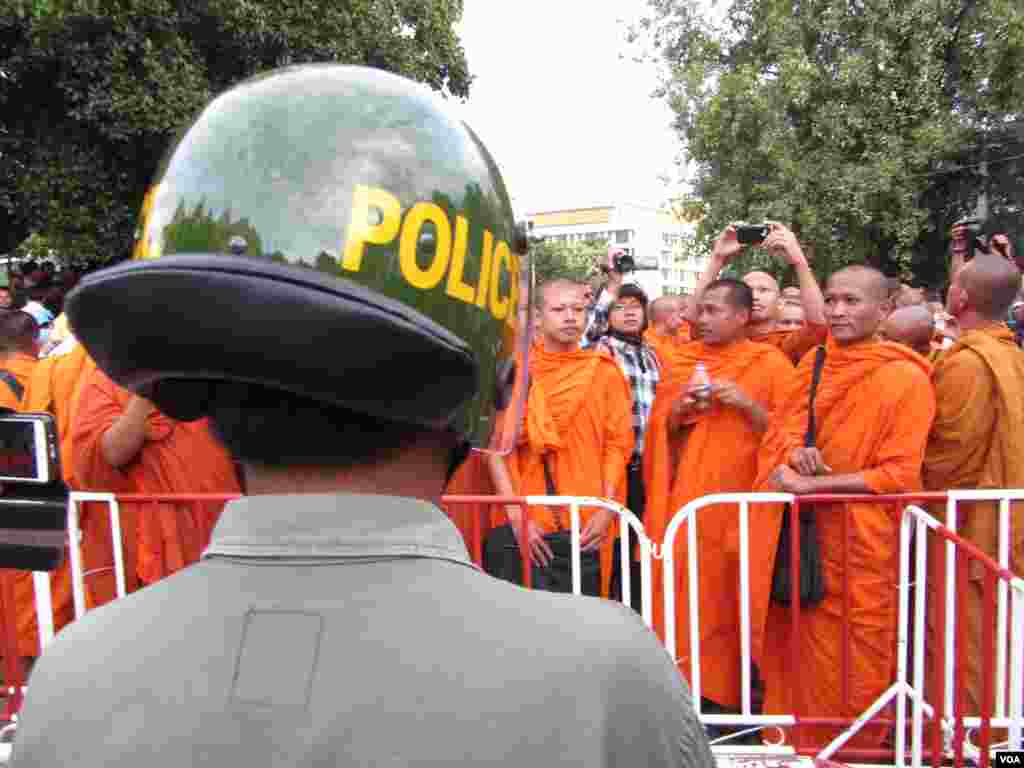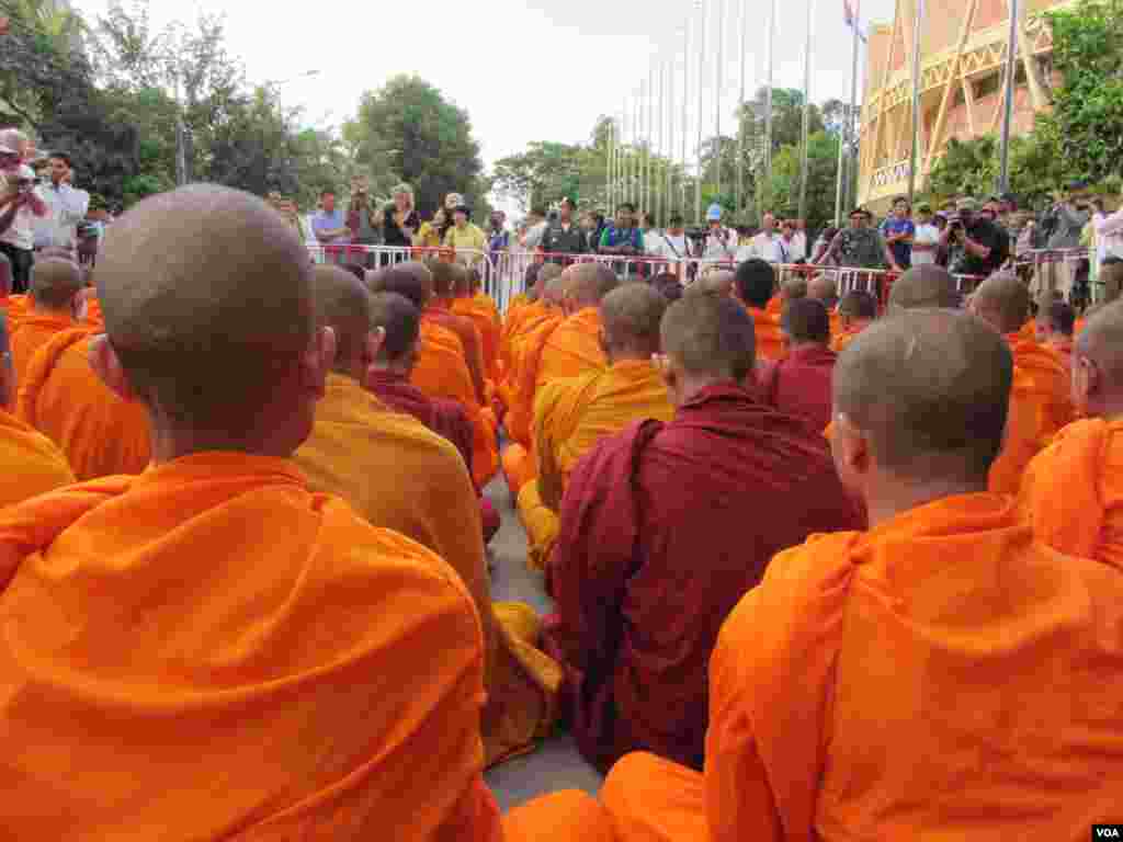 More than 150 monks gathered together on Thursday to submit a petition to the Royal Palace, asking that King Norodom Sihamoni postpone a National Assembly session on Sept. 23 that the opposition has threatened to boycott. The session follows the July 28 election, which opposition leaders say they lost due to irregularities and fraud. The monks were stopped by security forces, who had blocked the roads surrounding the palace. (Photos by Khoun Theara, VOA Khmer)