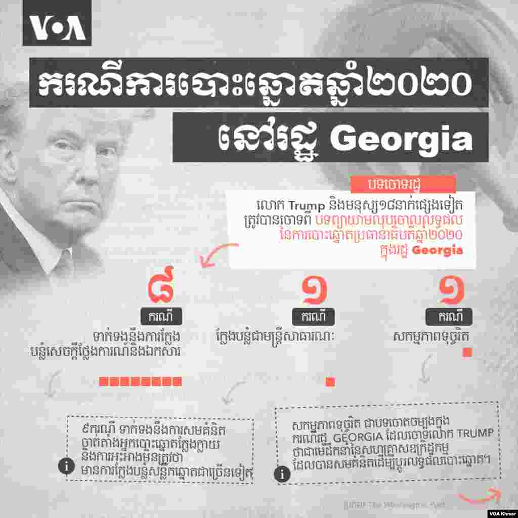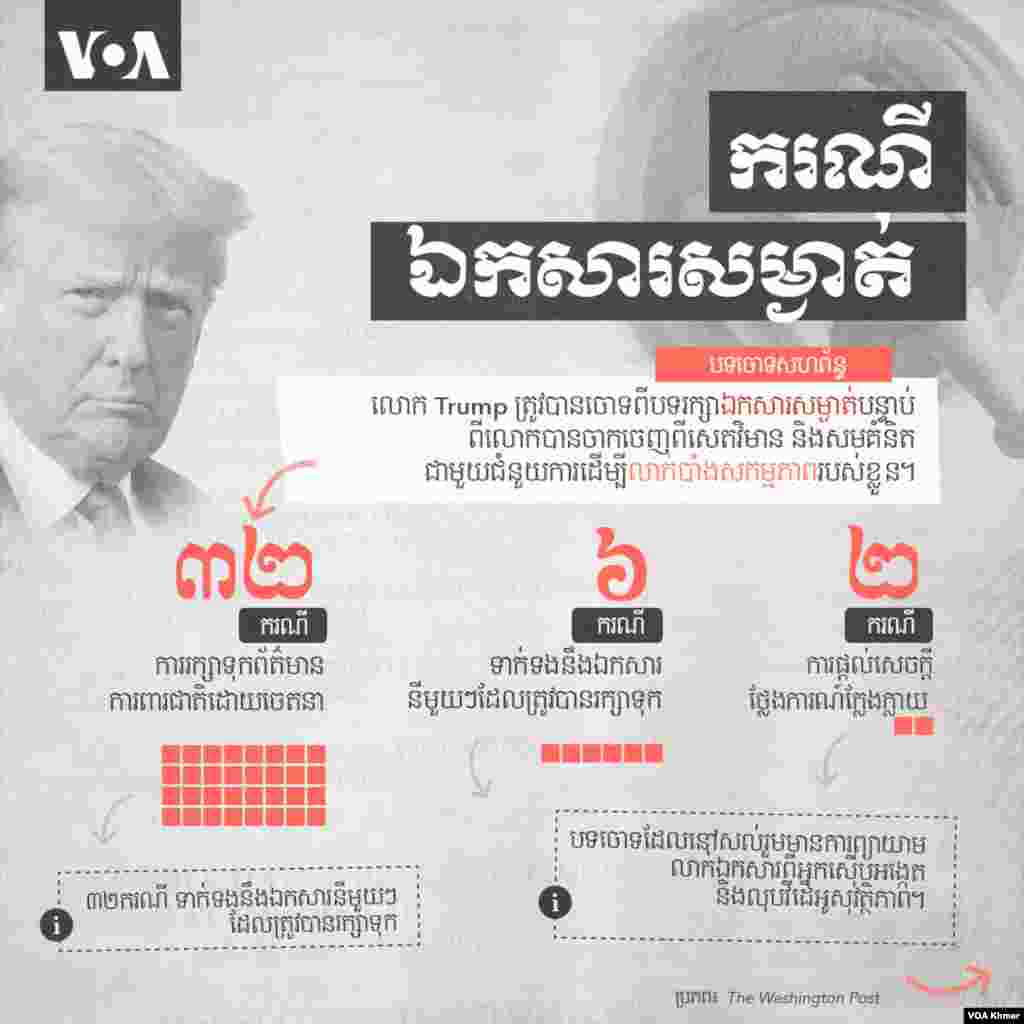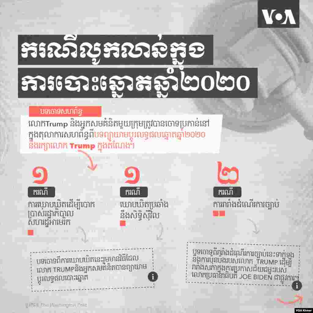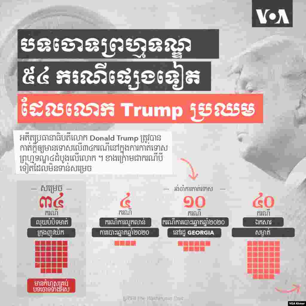 អតីតប្រធានាធិបតីលោក Donald Trump ត្រូវបានកាត់ក្តីឲ្យមានទោសលើបទព្រហ្មទណ្ឌទាំង៣៤ករណីក្នុងតុលាការព្រហ្មទណ្ឌក្នុងទីក្រុងញូវយ៉ក ដែលរួមមានបទព្យាយាមដោយខុសច្បាប់លើការបង្កើនឥទ្ធិពលទៅលើលទ្ធផលបោះឆ្នោតដ៏ជោគជ័យរបស់លោកក្នុងឆ្នាំ២០១៦ តាមការបង់ប្រាក់បំបិទមាត់ឲ្យតារាភាពយន្តអាសអាភាសដែលបាននិយាយថានាងបានរួមភេទជាមួយលោក។ លោកនៅតែប្រឈមនឹងការកាត់ទោសព្រហ្មទណ្ឌបីផ្សេងទៀត ដែលសរុបមានចំនួន៥៤បទចោទ រួមមានការសមគំនិតដើម្បីលុបចោលលទ្ធផលនៃការបោះឆ្នោតប្រធានាធិបតីឆ្នាំ២០២០។ លោក Trump បានបដិសេធថាមិនមានកំហុសក្នុងករណីទាំងនោះ។ នេះជាតារាងសង្ខេបករណីទាំងបីនោះនិងបណ្តាការចោទប្រកាន់ដែលទាក់ទង៖