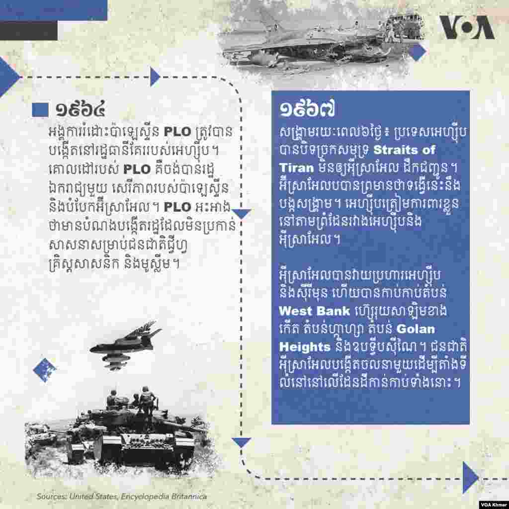 កាលពីថ្ងៃទី៧ តុលា ឆ្នាំ២០២៣ ក្រុមហាម៉ាស់បានឆ្លងចូលភាគខាងត្បូងអ៊ីស្រាអែលដោយសម្លាប់មនុស្ស១២០០នាក់និងចាប់ជម្រិតមនុស្ស២៤០អ្នកផ្សេងទៀត។ ដើម្បីឆ្លើយតប អ៊ីស្រាអែលបានប្រកាសធ្វើសង្រ្គាមជាមួយហាម៉ាស់និងបានវាយប្រហារតាមអាកាសនិងវាយលុកផ្លូវគោកទៅក្នុងតំបន់ហ្កាហ្សា។ បន្ទាប់ពីការប្រយុទ្ធច្រើនជាង៩០ថ្ងៃ ជនជាតិប៉ាឡេស្ទីនជាង២ម៉ឺននាក់ក្នុងតំបន់ហ្កាហ្សាត្រូវបានសម្លាប់ និងជាច្រើនលាននាក់ទៀតបានផ្លាស់ទីលំនៅ។ ផ្ទះសម្បែង សាលារៀន ព្រះវិហារឬអគារផ្សេងៗត្រូវបានកម្ទេច។ អ្នកជំនាញនិយាយថានេះជាការប្រយុទ្ធដ៏សាហាវបំផុតក្នុងប្រវត្តិសាស្ត្របច្ចុប្បន្ន។ ហាម៉ាស់បន្តឃុំខ្លួនចំណាប់ខ្មាំង១០០នាក់នៅហ្កាហ្សា។ អ៊ីស្រាអែលបានរាយការណ៍ថាទាហានរបស់ខ្លួនចំនួន១៧៥នាក់បានស្លាប់។ ខាងក្រោមនេះជាភាគ២នៃ តារាងពេលវេលាដែលបង្ហាញពីប្រវត្តិរបស់ប៉ាឡេស្ទីននិងអ៊ីស្រាអែល ដែលបណ្តាលឲ្យមានការវាយប្រហារតាំងពីថ្ងៃទី៧តុលា ឆ្នាំ២០២៣មក។